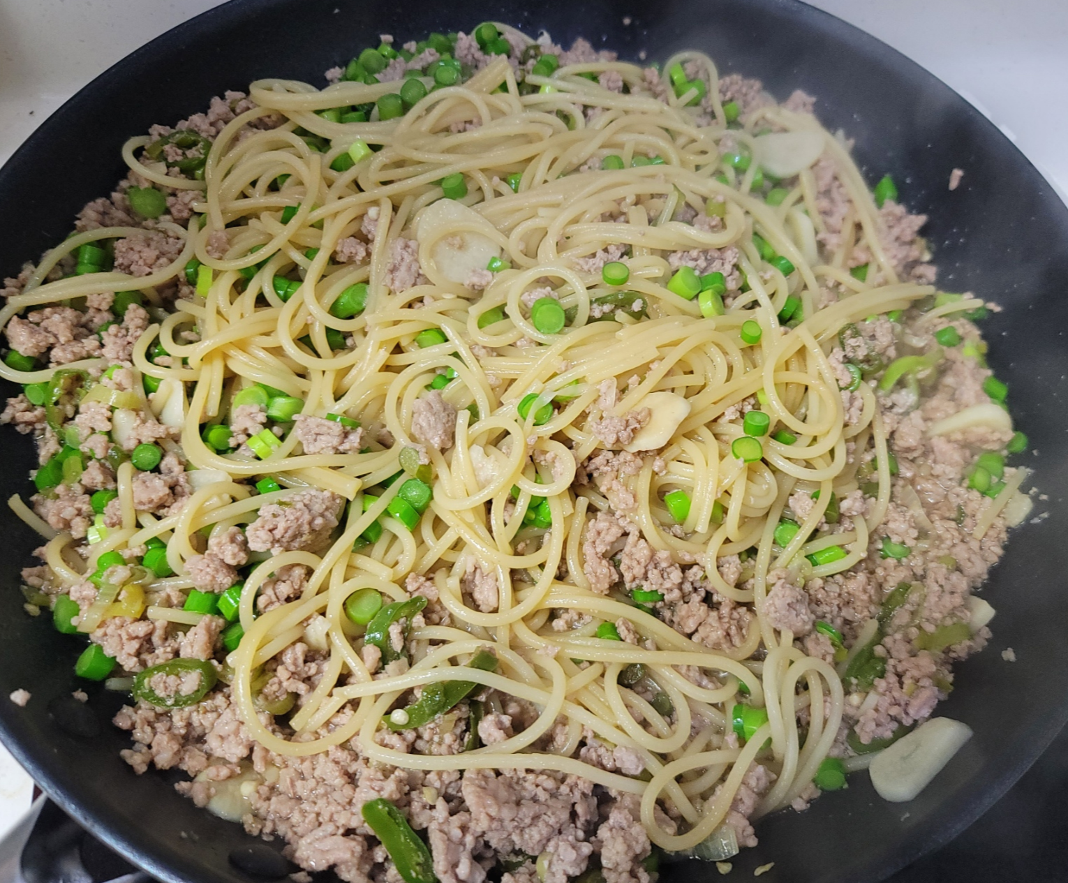 영상에서 볶는걸 잘 봐보니까, 고추, 마늘, 파가 보인다. (파는 맞는지 잘 모르겠다.) 집에 있는 거 꺼내다가 썰어 재낀다. 너무 신나게 썰다 보니 사진찍는걸 깜빡했다. 썰다보니 면이 익기까지 얼마 안 남았다. 서둘러 고기까지 꺼내다가 볶아 본다.