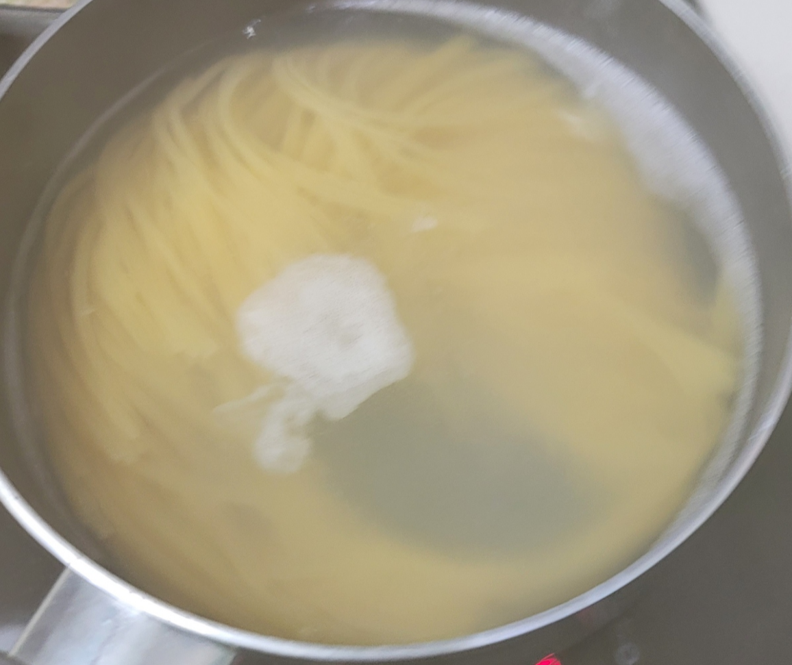 문제는 이제 승우아빠님이 쓰는 제품이다. 저런 걸 찾아서 사기는 좀 그렇다. 내 요리의 목적 중 하나는 남은 파스타면과 야채 처리이다. 일단 면은 그냥 삶아본다. 알리오 올리오 영상에서 삶듯이 그냥 삶는다. 소금 간도 한다. 면 삶는 거 사진 찍기는 참 어렵다. 수증기 때문에 맨날 뿌옇다.